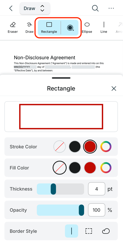 Tip: Click the dropdown circle to adjust the shape settings - stroke color, fill color, thickness, opacity, and border style.