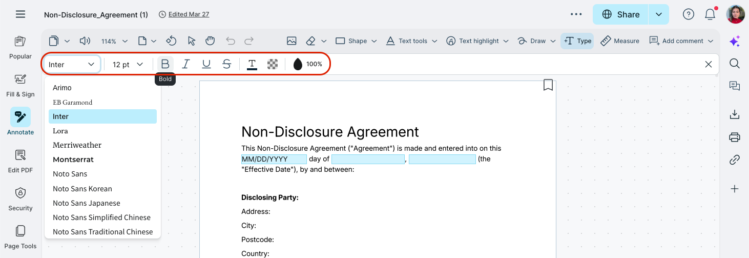 Personalize your annotations and signatures with a variety of colors and fonts in Lumin.