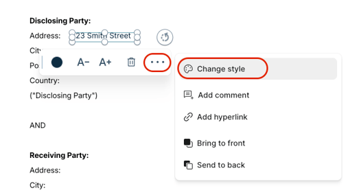 TIP: For text that's already been added to the document, click on the text, click on the 3 dots and click change style to edit font, color and more.