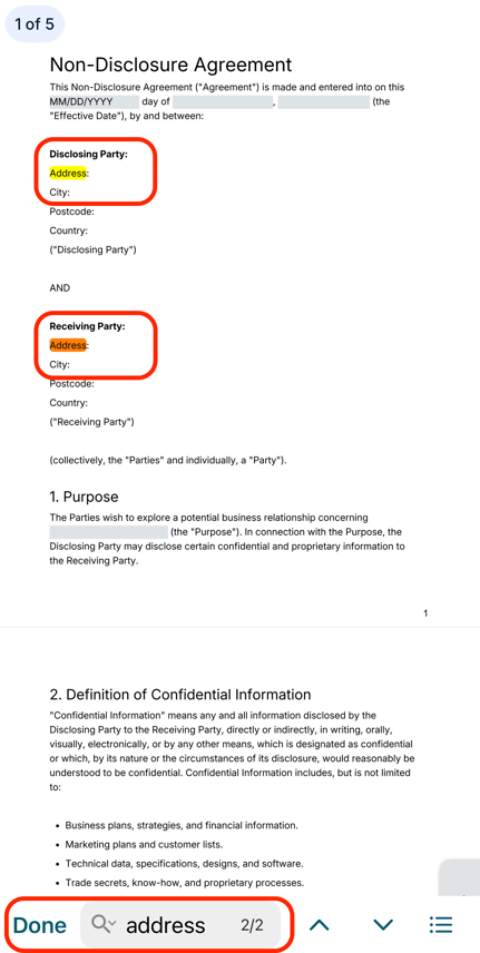 3. Hit done - any matches will appear on the document highlighted in orange.