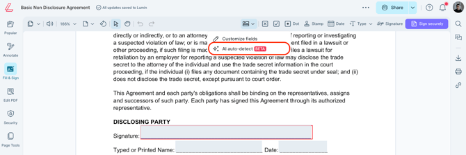 NOTE: This feature is currently in its BETA phase, undergoing user testing. If you encounter any inaccuracies in field detection, we encourage you to share your feedback with us at support@luminpdf.com. Your input is invaluable in helping us improve the tool.
