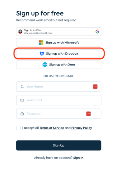Create a Lumin account via Dropbox
