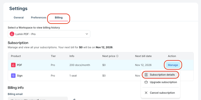 - Next, head to the Billing page. Under Subscription, click Manage.