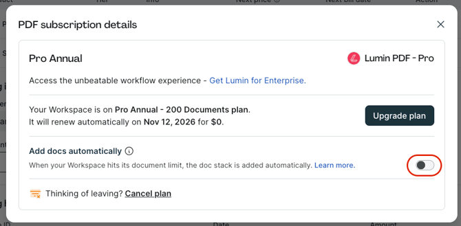 Learn how to control the automatic document addition feature for your Lumin PDF doc stack, helping you avoid unexpected charges when you hit your monthly document limit.