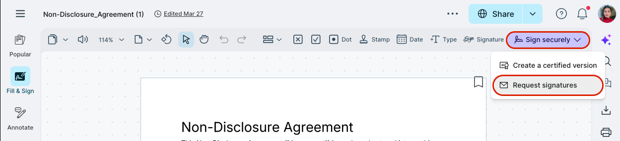 - Once you've made the changes, click the Sign Securely button on the right-hand side of the page. Then click Request Signatures.