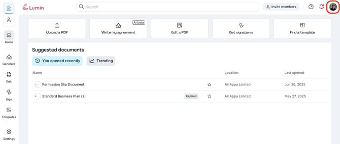 - From the Lumin home page, click your account profile icon (top-right of the page).